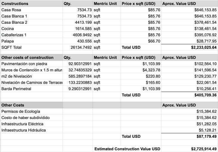 Table of Estimated Value of Constructions, Infrastructure, and Others included with the property.